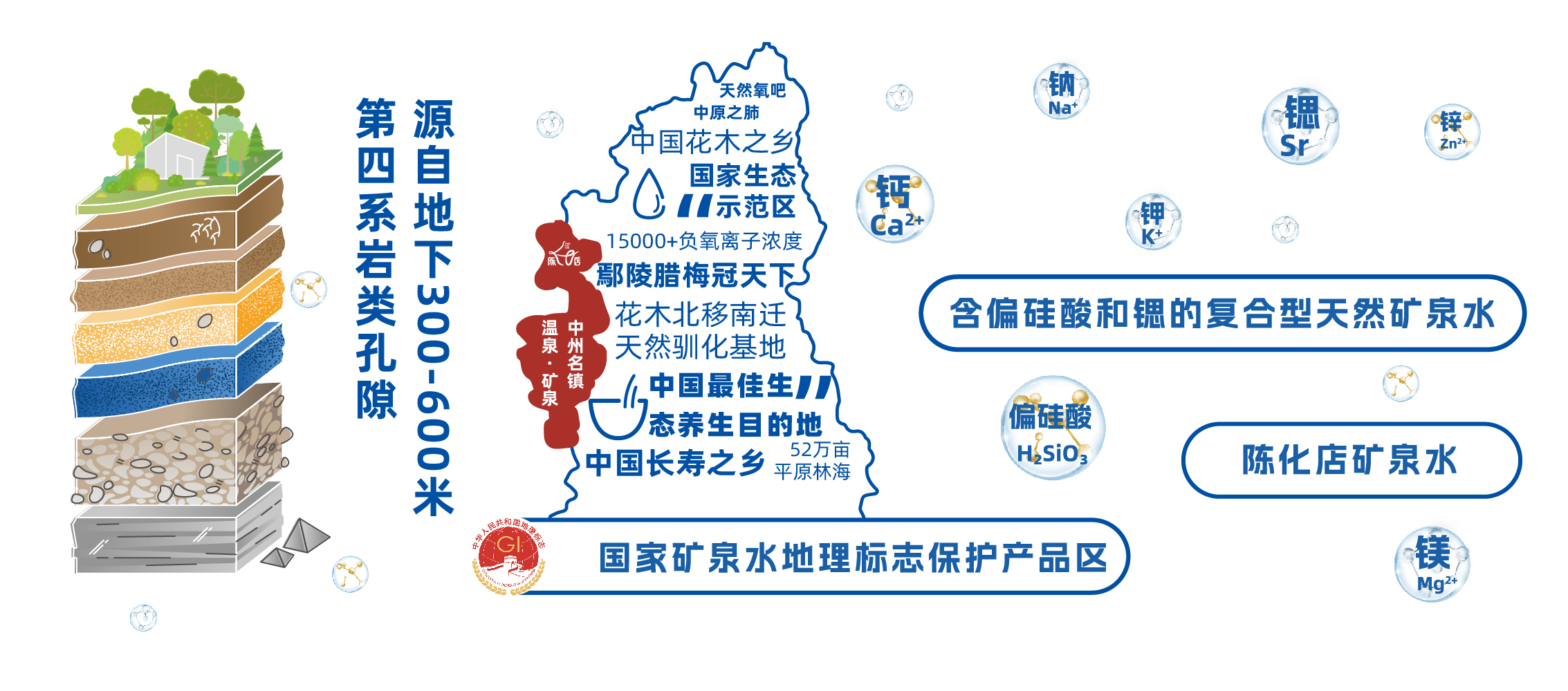 腊梅园系列饮用水取自陈化店镇国家矿泉水地理标志保护区,采水深度300至600米,为深层地下岩层水,其中锶含量≥0.60mg/L,偏硅酸含量≥26.0mg/L。公司严格执行200米以上全封闭采水保护措施,有效防止雨水及有害物质渗入,确保每一滴水都纯净无污染,达到优质饮用水标准。